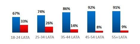 Analiza odpowiedzi według grup wiekowych pokazuje, że najwięcej osób, które segregują śmieci jest wśród osób w wieku 45-54 lata (92%) oraz 55 lat i więcej (91%). Z kolei zdecydowanie najmniej jest ich w najmłodszej grupie wiekowej 18-24 lata (67%). I w tej grupie jest aż 33% osób, które śmieci nie segregują.