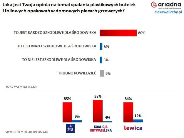 Zdecydowana większość Polaków (80%) uważa, że spalanie plastikowych butelek i foliowych opakowań w domowych piecach grzewczych jest bardzo szkodliwe dla środowiska. 6% uważa, że to jest mało szkodliwe, a 5% – że nie jest szkodliwe. Prawie co dziesiąta osoba (9%) nie ma na ten temat zdania. Świadomość dotycząca szkodliwości takich działań jest najwyższa wśród wyborców Koalicji Obywatelskiej (95%). Wśród elektoratu Prawa i Sprawiedliwości oraz Lewicy jest praktycznie na takim samym poziomie (85% vs. 84%).