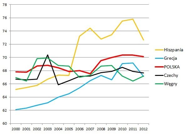 No właśnie, a jak zmieniał się nasz wskaźnik równości płci w czasie? W 2007 roku malał, potem zaczął rosnąć, w 2011 roku stanął w miejscu, a w 2012 roku znowu się zmniejszył. Łącznie w latach 2006-2012 poprawiliśmy naszą notę o 2,18 punktu procentowego. Dla porównania, największy postęp dokonał się w Nikaragui (+11,34 punktu procentowego), a w Europie – w Islandii (+8,27 punktu procentowego). W okresie tym dokładnie połowa krajów świata i 14 krajów europejskich poprawiło GGI w większym stopniu niż Polska. WEF oszacował też dla wybranych krajów wartość tego wskaźnika od 2000 roku. Okazało się, że w grupie 39 państw Polska znalazła się w szóstce krajów (co ciekawe: wraz z Czechami, Węgrami, Słowacją, Litwą i Wielką Brytanią) o najmniejszej poprawie GGI. Od 2000 roku wyniosła ona w Polsce tylko 2,31 punktu procentowego, co oznacza, że zmiany następują u nas niezwykle wolno. Szwajcaria we wspomnianym okresie 2000-2012 poprawiła poziom równości o 13,16 punktu procentowego…