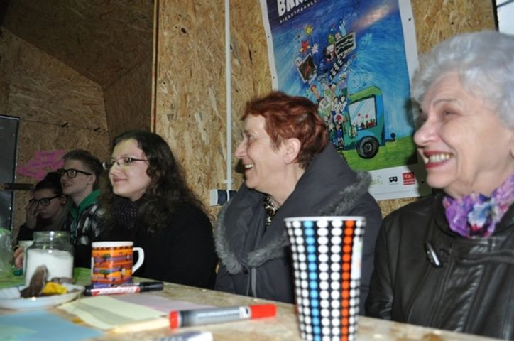 Zanim jednak grupa projektowa – PoWSInogi i goście weszli do środka – przy wejściu do barakowozu została przeprowadzona „akcja kubek dla PoWSInogi”, czyli wręczenie kubków projektowych z napisem: barakowozowi PoWSInoga. Taki kubek dostali w prezencie od uczestników Burmistrz Gniewkowa i Dyrektor MGOKSiR.