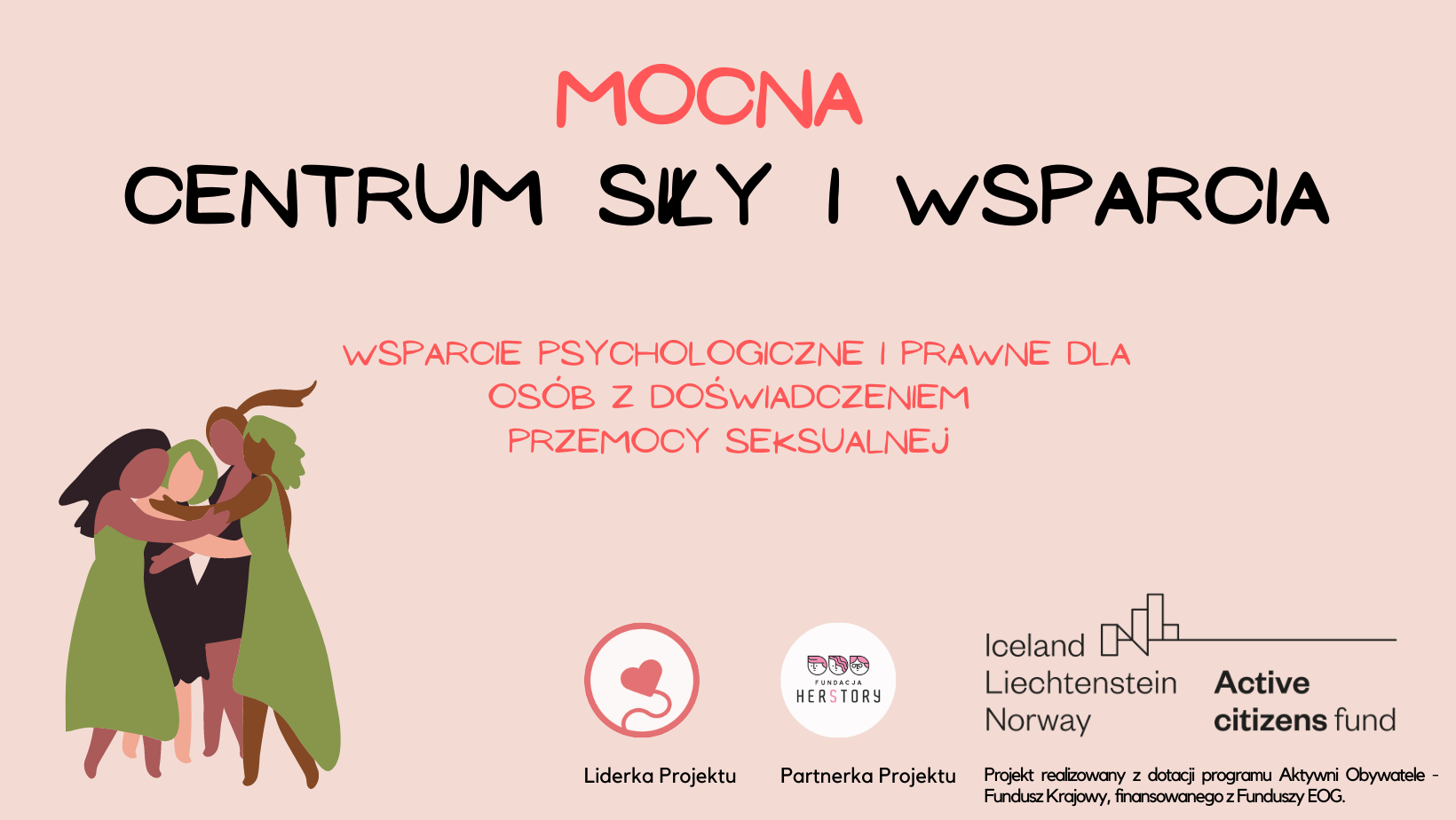 Mocna – Centrum Siły i Wsparcia – to projekt realizowany z dotacji Program, Program Aktywni Obywatele – Fundusz Krajowy, Finansowanego z Funduszy EOG. Liderką projektu jest Fundacja Preludium, która ma doświadczenie w niesieniu szeroko rozumianej pomocy psychologicznej osobom doświadczającym/ z doświadczeniem przemocy seksualnej. Mocna – Centrum siły i wsparcia adresowana jest do mieszkanek aglomeracji Poznańskiej, które doświadczyły/doświadczają przemocy seksualnej.
