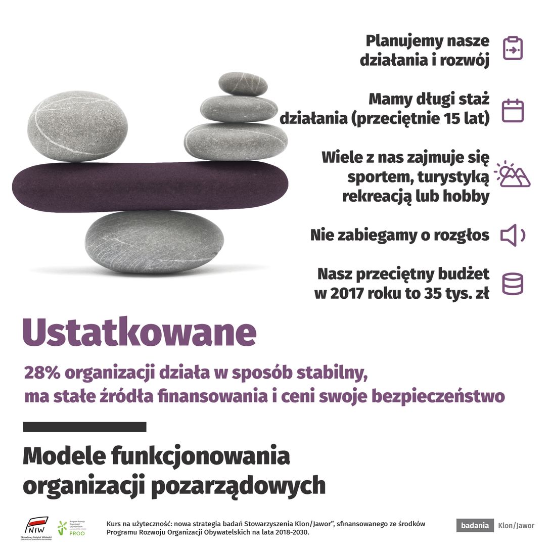 Organizacje ustatkowane to 28% całego sektora pozarządowego. Są to takie stowarzyszenia i fundacje, które działają w sposób stabilny, mają stałe źródła finansowania, cenią swoje bezpieczeństwo. Tego typu organizacje planują zarówno swój budżet, jak i działania i kierunku rozwoju. Nie zależy im na szerokim promowaniu swoich działań, nie zabiegają o obecności w mediach. Organizacje ustatkowane mają długi staż działania (przeciętnie 15 lat), często zajmują się sportem, turystyką rekreacją lub hobby. Ich przeciętny budżet to 35 tys. zł, czyli więcej niż przeciętna w całym sektorze pozarządowym (28 tys. zł), choć nie jest segment organizacji z najwyższymi przychodami.