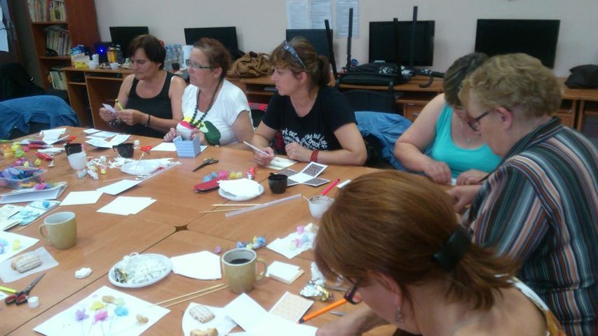 Dobiegają końca cieszące się dużym zainteresowaniem warsztaty rękodzielnicze. Do tej pory odbyły się 4 warsztaty scrapbookingu – czyli papierowych wariacji. Kobiety uczyły się wykonywać ozdobne karty okolicznościowe i pudełka ozdabiane papierowymi elementami i koralikami; metody quillingu oraz techniki pergamano. Za nimi także 4 warsztaty tworzenia biżuterii. Podczas warsztatów sutaszu oraz filcowania na sucho i mokro wyszła z ich rąk bardzo modna i wyróżniająca się biżuteria. Ostatnie zaplanowane warsztaty poświęcone są metodzie postarzania przedmiotów metodą shabby chic. Do tej pory odbyły się dwa z czterech warsztatów, podczas których uczestniczki przekształciły nowe skrzyneczki, pudełeczka, drewniane serduszka w “wiekowe” i podniszczone zębem czasu.