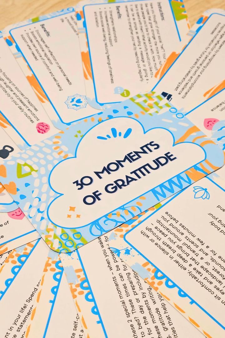 Każda karta zawiera jedno ćwiczenie z wypunktowanymi korzyściami dla naszego dobrostanu. Dodatkowo w zestawie znajdziemy tabelę emocji, która pomaga w nazywaniu tego, co czujemy oraz koło dobrostanu psychicznego, które pomaga w spojrzeniu na nasze samopoczucie w sposób holistyczny. Dołączono także dwie puste karty, na własne pomysły i aktywności.