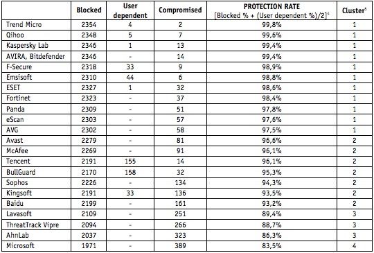 Niekwestionowanym zwycięzcą okazał się pakiet Trend Micro, osiągając wynik skuteczności 99,8%. Kolejne miejsca na podium przypadły Qihoo 360 Internet Security (99,6%) oraz Kaspersky Internet Security (99,4%). Najgorzej spisał się pakiet Microsoftu, osiągając wynik zaledwie 83,5%. Wśród darmowych programów, Avast przegrał z AVG, które zablokowało o 23 zagrożenia więcej. Natomiast pakiety AVG, AhnLab, Kaspersky Lab, Lavasoft oraz Bitdefender osiągnęły najlepsze wyniki, jeśli chodzi o fałszywe alarmy.