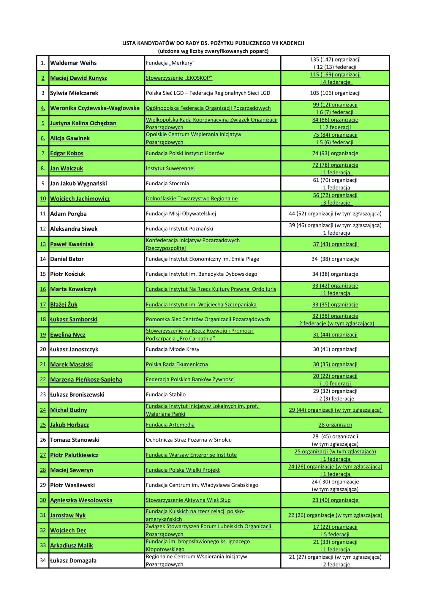 Publikujemy Państwu listę kandydatów ze strony pozarządowej do RADY DZIAŁALNOŚCI POŻYTKU PUBLICZNEGO VII KADENCJI, ułożoną wg liczby zweryfikowanych poparć.