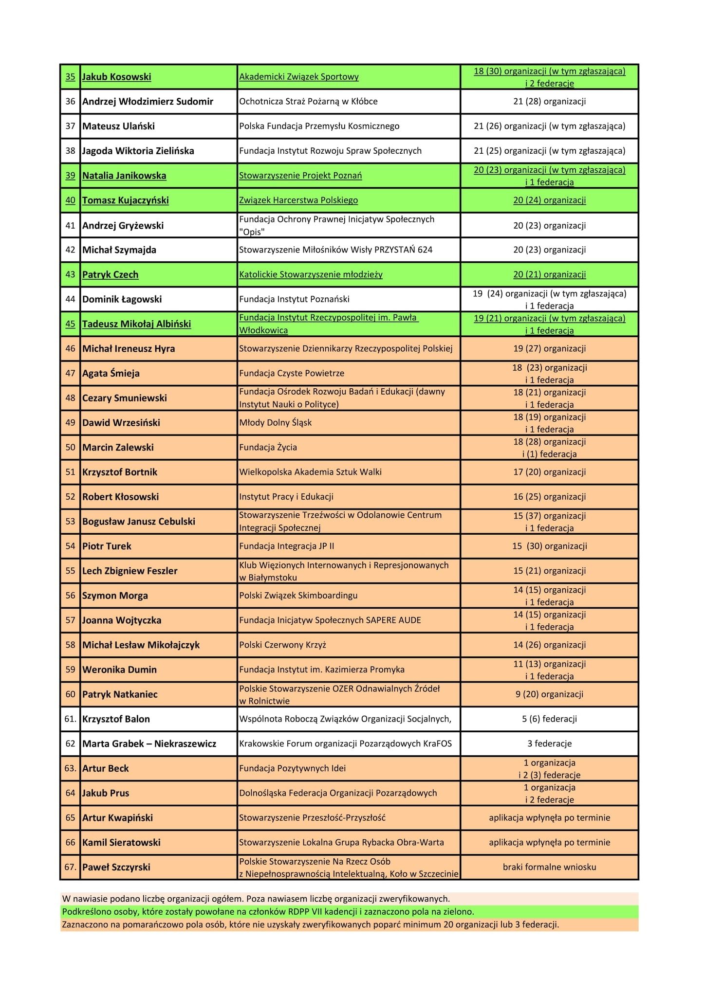 Zaznaczono na pomarańczowo pola osób, które nie uzyskały zweryfikowanych poparć minimum 20 organizacji lub 3 federacji.