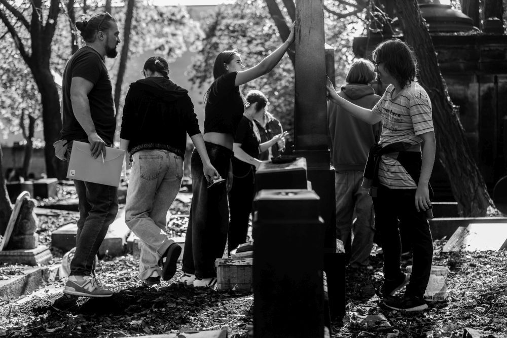 Stary cmentarz żydowski w Gliwicach (założony w 1815 r.). W cieniu drzew, otoczeni macewami (żydowskimi nagrobkami), uczestnicy zajęć czyścili XIX- i XX-wieczne kamienie nagrobne. Spokojna atmosfera sprzyjała refleksji, pogłębianiu wiedzy o historii lokalnej i zagadnieniom związanym z rzeźbą.