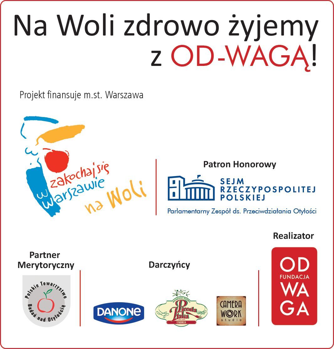 Projekt „Na Woli zdrowo żyjemy z OD-WAGĄ!” realizowany był pod Patronatem Honorowym Parlamentarnego Zespołu ds. Przeciwdziałania Otyłości Sejmu RP, w Partnerstwie Merytorycznym Polskiego Towarzystwa Badań nad Otyłością oraz z pomocą Darczyńców: firmy DANONE, restauracji „Piccola Italia” i studia fotograficznego CAMERA WORK Studio.