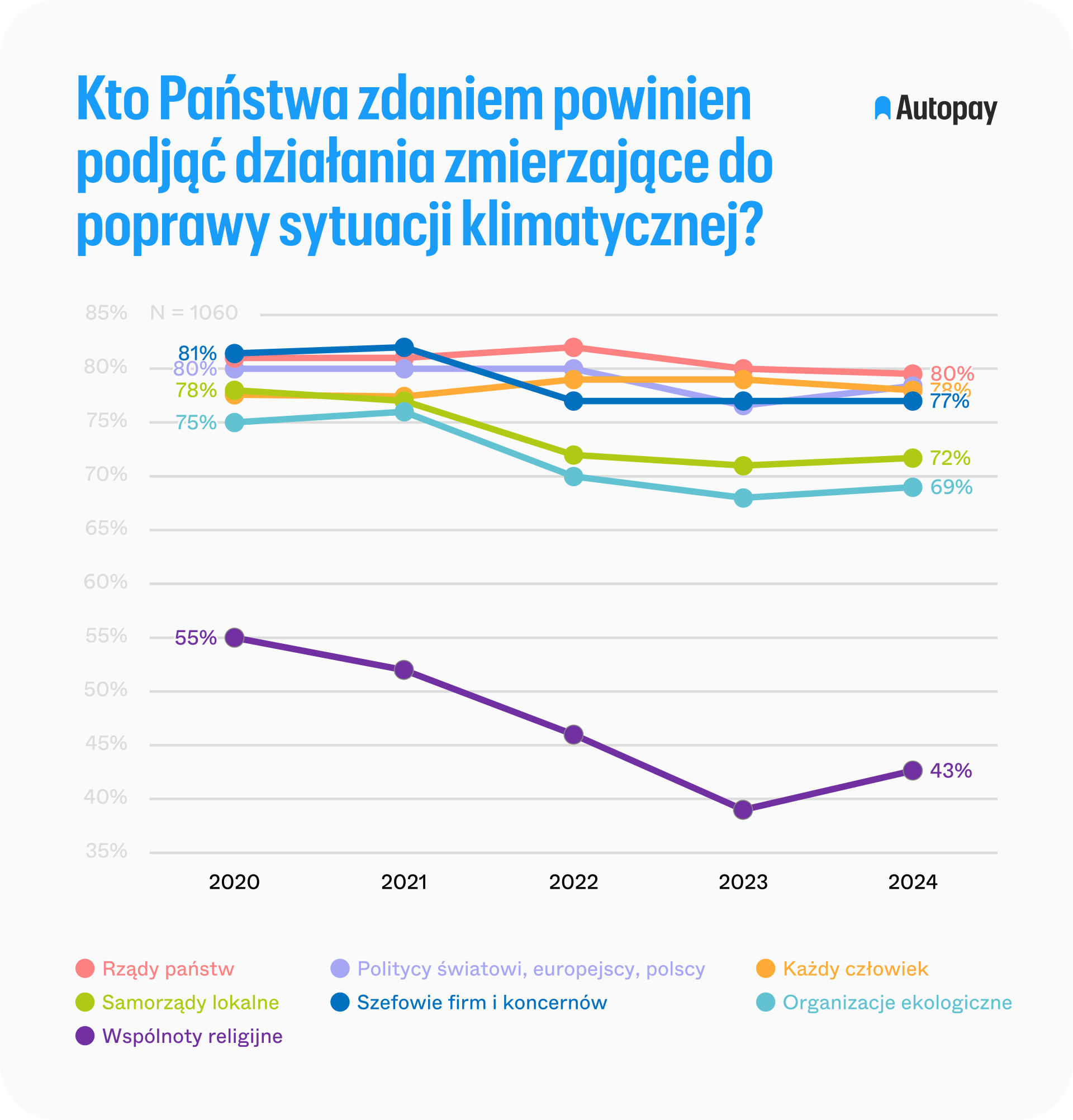Badani wydają się świadomi roli, jaką odgrywa społeczeństwo w zmianach, jakie przechodzi klimat. Zapytani o sytuacje, za które w szczególnym stopniu odpowiadają zaniedbania człowieka w kwestiach ekologicznych respondenci coraz częściej wskazują na powodzie oraz nagłe zjawiska pogodowe. Co istotne, badani nie uchylają się od odpowiedzialności – aż 78 proc. uważa, że działań naprawczych powinien się podjąć każdy z nas.