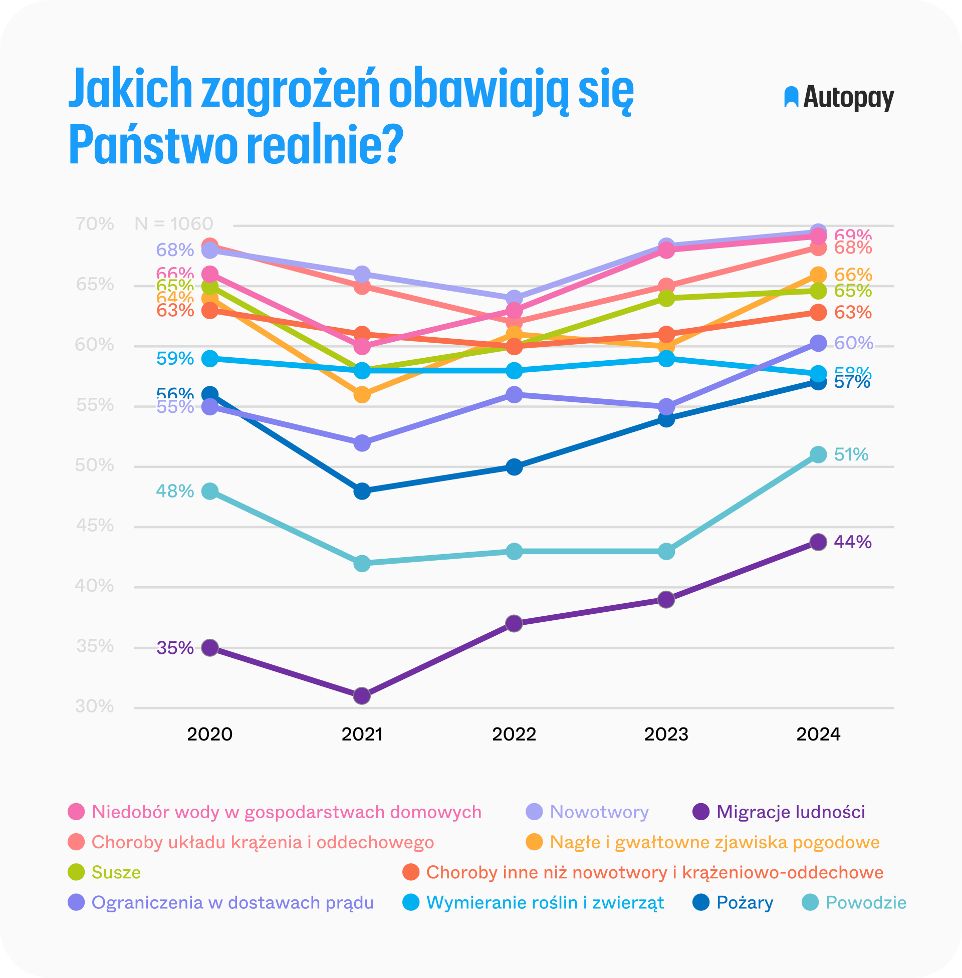 Respondenci - pytani o zagrożenia, które mogłyby dotyczyć ich bezpośrednio - coraz częściej wyrażają obawy związane z ekstremalnymi zjawiskami pogodowymi. Aż 66 proc. wskazuje na zagrożenie ze strony burz i huraganów, a 65 proc. obawia się suszy. Szczególnie zauważalny jest wzrost niepokoju wobec powodzi, którą jako realne zagrożenie postrzega już 51 proc. badanych. Co więcej, wzrost zanotowały prawie wszystkie wspomniane w badaniu potencjalne zagrożenia.