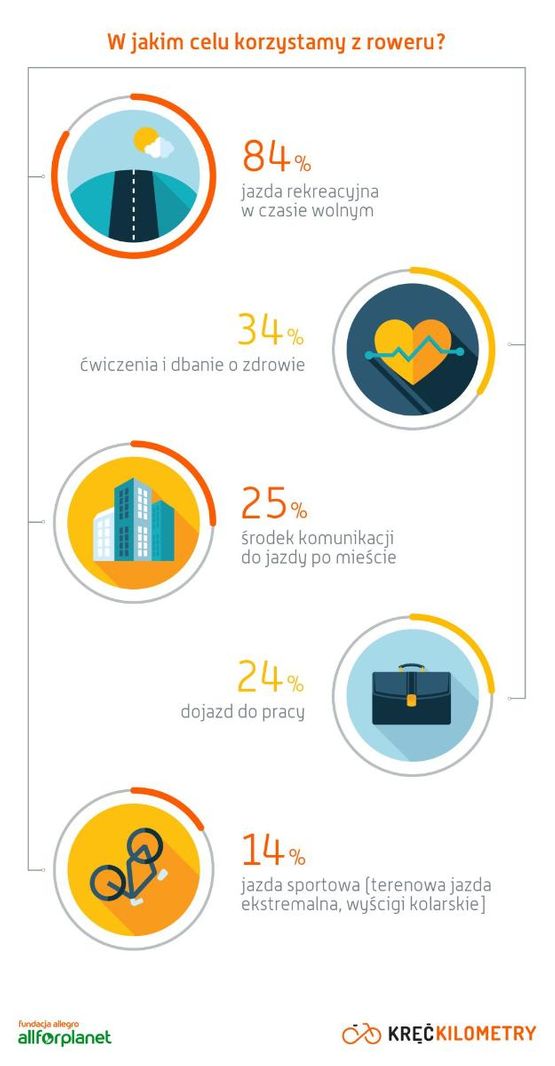 Jaki jest najpopularniejszy sport wśród Polaków? Zapewne większość pomyśli: piłka nożna, pływanie, może bieganie? Według Diagnozy Społecznej z 2013 roku jest to jazda na rowerze. Fundacja Allegro All For Planet, która zajmuje się promocją jazdy na „dwóch kółkach”, zbadała zwyczaje rowerowe Polaków.