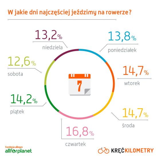 *Zwyczaje rowerowe zostały przedstawione na podstawie analizy aktywności ponad 100 000 użytkowników aplikacji mobilnej „Kręć Kilometry” oraz raportu TNS Polska dla Fundacji Allegro All For Planet z 2014 roku.