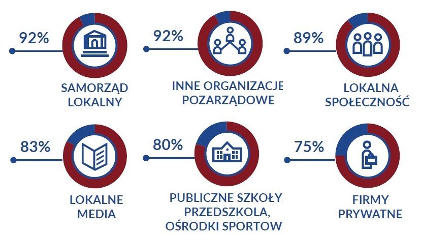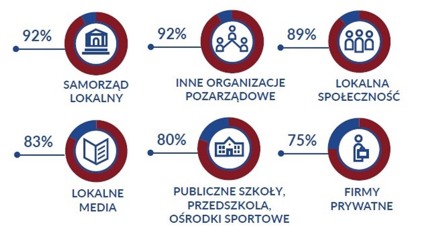 Organizacje najczęściej utrzymują kontakty z lokalnymi samorządami oraz innymi NGO (po 92%), lokalną społecznością (89%), mediami lokalnymi (83%), publicznymi szkołami, przedszkolami, ośrodkami sportowymi (80%) oraz firmami (75%). Jeśli pod uwagę weźmiemy kontakty trwałe i regularne głównymi partnerami NGO będzie lokalny samorząd oraz lokalna społeczność (po 46% organizacji ma z nimi takie relacje) oraz publiczne szkoły i przedszkola (34%).
