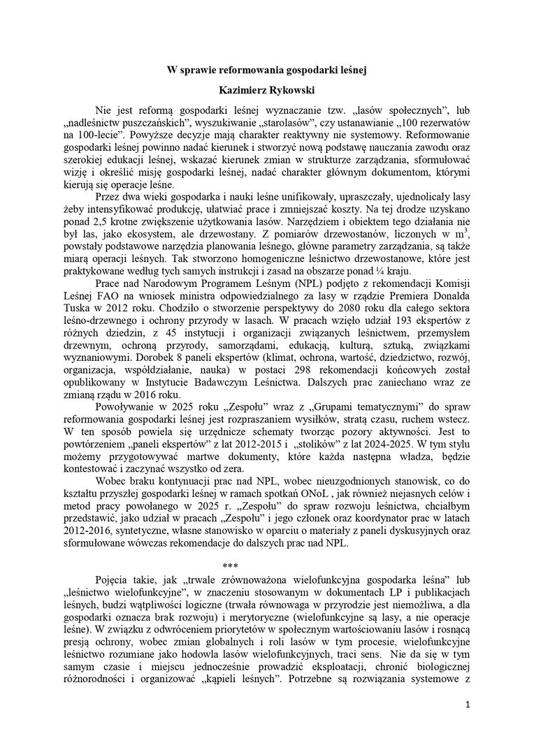 Aktywiści zaangażowani w debatę o lasach dotarli do protestu wystosowanego przez członka zespołu Narodowego Programu Leśnego (NPL), który został wznowiony w październiku 2025 przez Ministerstwo Klimatu i Środowiska (MKiŚ). Prof. dr hab. Kazimierz Rykowski, międzynarodowy ekspert w dziedzinie leśnictwa, autor i koordynator pierwszej edycji prac nad Programem z lat 2012-2016, wskazuje na niejasne założenia wszczętego na nowo procesu.