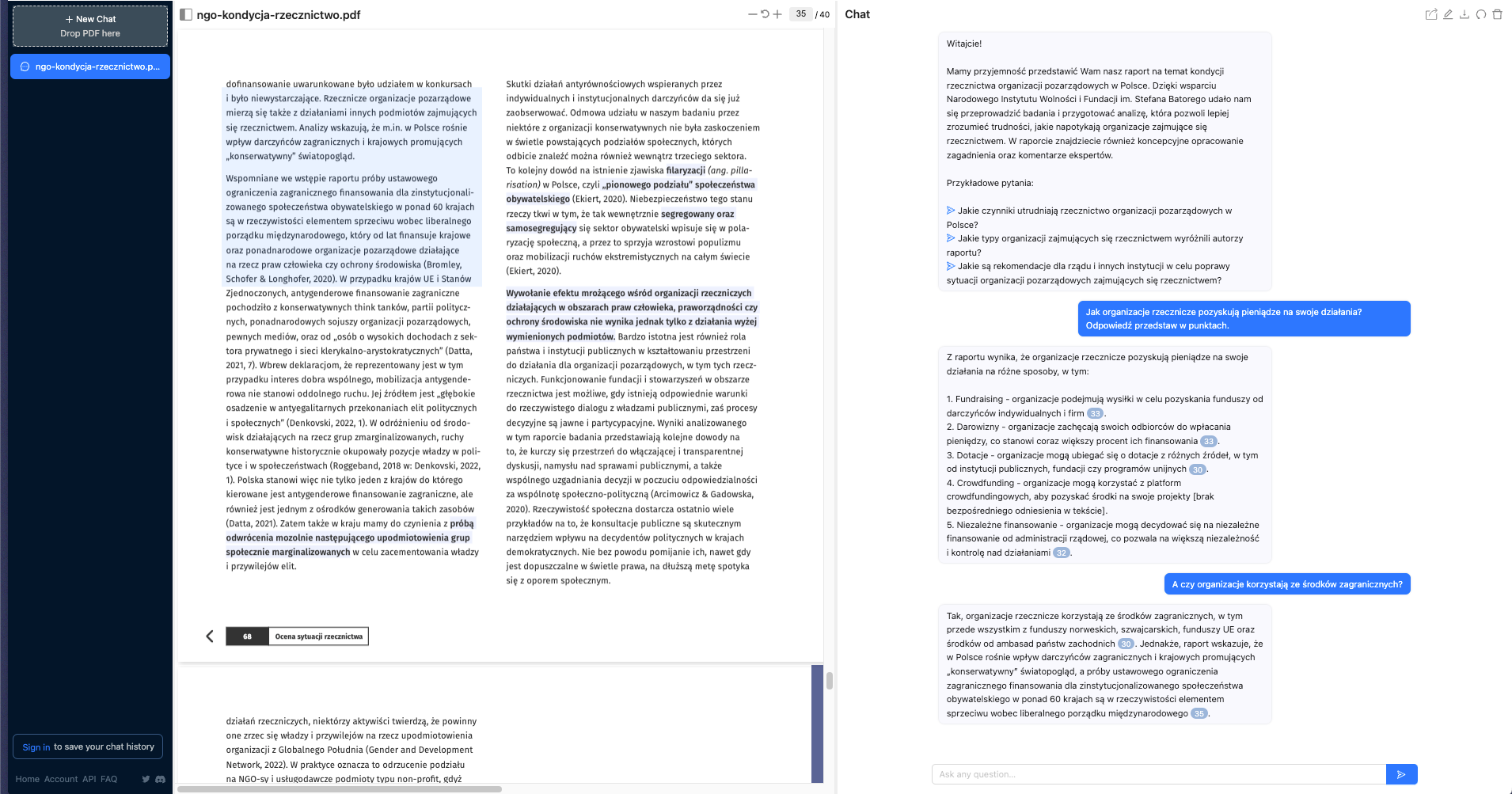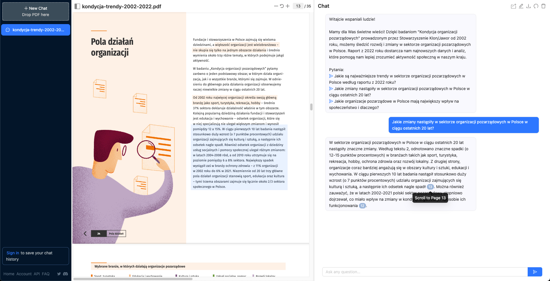 Z pomocą ChatPDF można zadawać szczegółowe pytania dotyczące treści dokumentów i otrzymywać szybkie i precyzyjne odpowiedzi. Narzędzie pod każdą z nich zamieszcza odnośnik do źródła w konkretnym miejscu pliku.