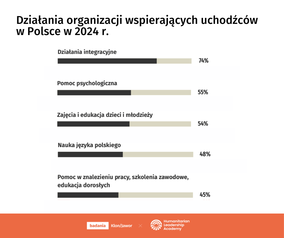 W pierwszym miesiącach po eskalacji wojny, w fazie recepcji, NGO-sy organizowały noclegi, żywność, dostęp do podstawowej opieki medycznej. Z czasem, potrzeby osób przebywających w Polsce ewoluowały, wymagając bardziej zaawansowanego wsparcia psychologicznego, edukacyjnego i językowego. Dziś, w okresie integracji nowych mieszkańców do polskiej społeczności, priorytetowe są działania włączające np. w rynek pracy.