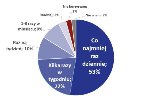 Niemal jedna czwarta (22%) korzysta z niego rzadziej: co dziesiąta (10%) organizacja zagląda do sieci raz na tydzień, a kolejne 9% kilka razy w miesiącu. Jest jeszcze niewielka grupa (3%) organizacji korzystająca z internetu sporadycznie (rzadziej niż raz na miesiąc).