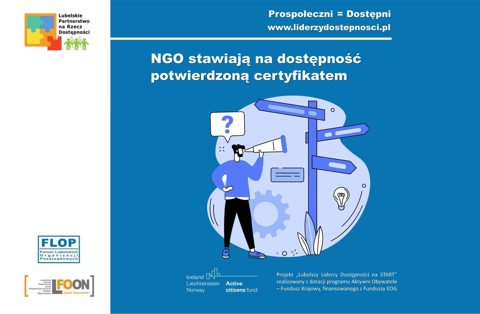 NGO powinny same zabiegać o dostępność, bo to jest dla nich opłacalne. Certyfikacja dostępności jest pierwszym krokiem do powszechnej standaryzacji i uporządkowania procesu wdrażania dostępności. Obecnie uprawnienia do wydawania certyfikatów dostępności mają wyłącznie niezależne akredytowane podmioty (w tym: NGO, przedsiębiorcy i uczelnie) wybrane w otwartym naborze przeprowadzonym przez Ministerstwo Funduszy i Polityki Regionalnej.