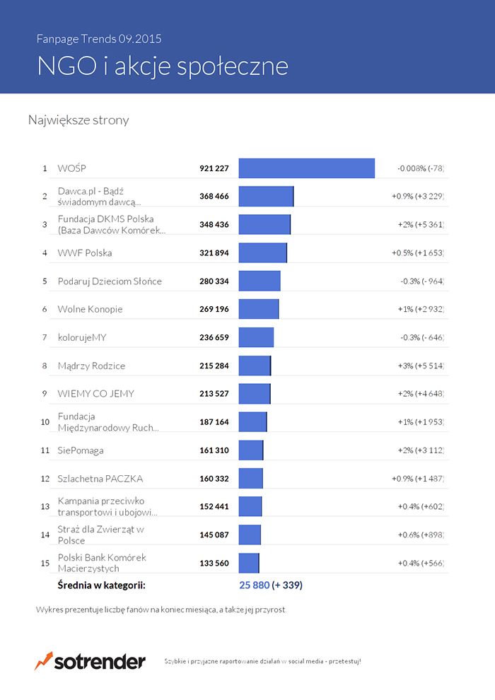 Największym fanpagem w kategorii niezmiennie jest opisywany już na samym początku kanał Wielkiej Orkiestry Świątecznej Pomocy. Dodajmy, że mimo pewnego rodzaju sezonowości działania prowadzonego przez fundację Jerzego Owsiaka, ta długo jeszcze będzie jednała rzesze skorych do pomocy Polaków, zwiększając do grono w styczniu każdego roku. Z ponad 920 tys. śledzących działania tego ngo-sa na Facebooku wciąż lideruje wykresowi z półmilionową przewagą. Na drugim i trzecim miejscu są pokrewne sobie organizacje - Dawca.pl i DKMS, obie pomagające w przeszczepach komórek macierzystych.