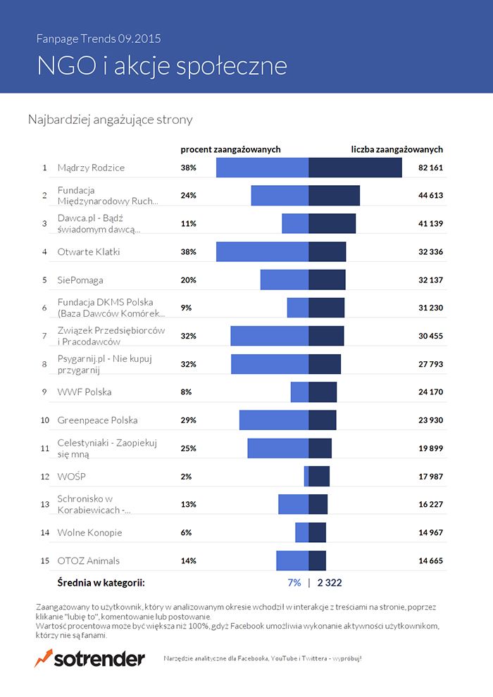 W przypadku najbardziej angażujących - nieinaczej - brak niespodzianek. Czołówka tego zestawienia nie zaskakuje, otwiera ją pojawiający się tu regularnie profil Mądrzy rodzice. Co ciekawe, jest to fanpage, który założył bohater jedynek gazet sprzed kilku lat - Jakub Śpiewak. Przypomnijmy - to bohater głośnej afery związanej z defraudacją pieniędzy Fundacji Kidprotect, które Polacy wpłacali na walkę z pedofilią. Strona, która nota bene nie do końca jest związana bezpośrednio ze światem organizacji pozarządowych jednak angażuje, co więcej, jest 8. największą na Facebooku. I w tym zestawieniu kolejne pozycje nie dziwią. To Fundacja Międzynarodowy Ruch Na Rzecz Zwierząt Viva! i Dawca.pl. Ten ostatni ma szanse dominować w rozpoczynającym się listopadzie - właśnie rozpoczął akcję #OddajSerce i powinien zamieszać w social mediach. Będziemy śledzić!