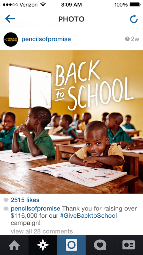 Tak jak Pencils of Promise, FEED wykonało świetną robotę w dzieleniu się informacjami o postępach kampanii. Publikowali swoje własne aktualizacje, a także zdjęcia udostępnione przez ich sympatyków, którzy zorganizowali Kolację FEED.