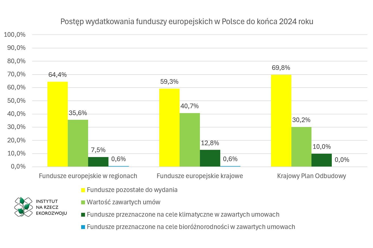 Według raportów przedstawionych przez instytucje zarządzające poszczególnymi funduszami europejskimi dla okresu do końca 2024 roku ilość zakontraktowanych środków na cele klimatyczne jest nieznacznie niższa od oczekiwanej, a w na cele bioróżnorodności znacznie niższa od oczekiwanej.