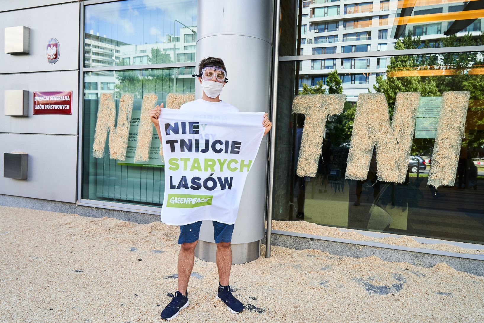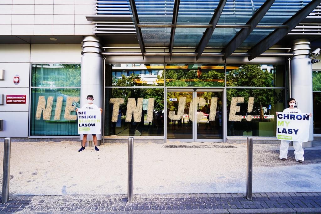 „Nie tnijcie!” – duży napis z trocin wylepili aktywiści i aktywistki Greenpeace na szklanych drzwiach warszawskiego biurowca, w którym mieści się siedziba Dyrekcji Generalnej Lasów Państwowych. W ten sposób organizacja domaga się zakończenia raz na zawsze wycinek we wszystkich najstarszych i najcenniejszych polskich lasach.