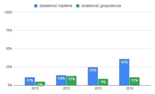Działalność gospodarcza takiego wzrostu nie notuje, od lat odsetek prowadzących ją organizacji pozostaje na podobnym poziomie, w 2018 roku prowadziło ją 11% organizacji.