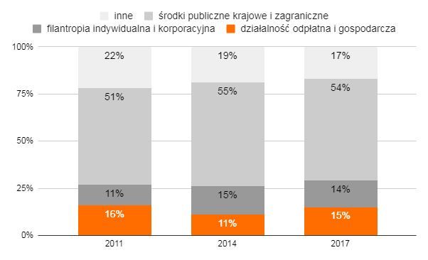 Mimo że z perspektywy budżetu całego sektora udział środków z tych dwóch źródeł jest podobny, to warto podkreślić, że działalność ekonomiczną prowadzi trzy razy mniej organizacji, niż korzysta z filantropii. Zatem wpływy do teoretycznego, pozarządowego budżetu z tytułu działalności ekonomicznej zapewnia 23% organizacji, a z filantropii – 63% organizacji.