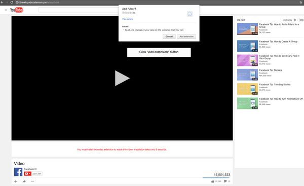 Końcówka svg sugeruje, że załączony plik ze zdjęciem ma niewiele wspólnego. “Zdjęcie”, po pobraniu, uruchamia skrypt w przeglądarce ofiary, który przekierowuje na fałszywe subdomeny podszywające się pod YouTube’a. Przeglądarka informuje, że do odtworzenia filmu potrzebne jest zainstalowanie rozszerzenia, w postaci brakującego codeca.
