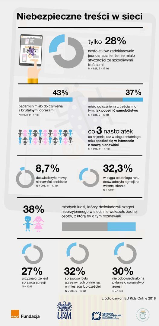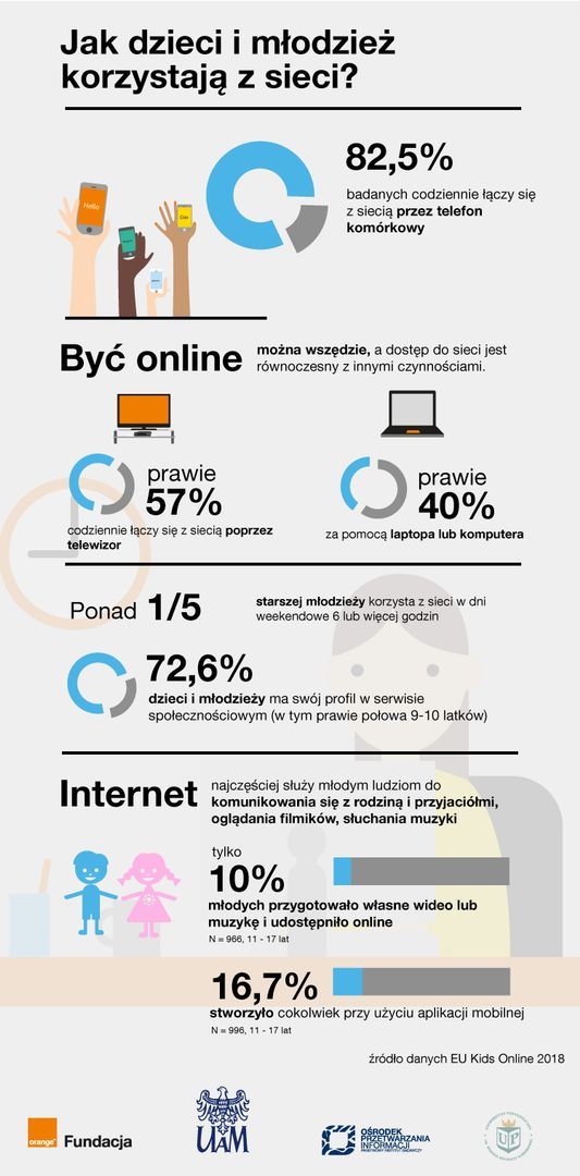 Pełen raport jest dostępny na stronie www.fundacja.orange.pl. Badania były przeprowadzone w 2018 roku na reprezentatywnej grupie dzieci i młodzieży w wieku 9-17 lat, 1249 uczniach z 90 szkół. Kwestionariusz był wspólny dla wszystkich europejskich krajów biorących udział w badaniach. Polska część badań EU Kids Online 2018 została zrealizowana przez zespół badawczy pod kierunkiem prof. Uniwersytetu Adama Mickiewicza dr hab. Jacka Pyżalskiego wraz z mgr Aldoną Zdrodowską (Ośrodek Przetwarzania Informacji – Państwowy Instytut Badawczy), dr Katarzyną Abramczuk (OPI PIB) oraz dr. Łukaszem Tomczykiem (Uniwersytet Pedagogiczny w Krakowie) w partnerstwie z Fundacją Orange. Jest to druga edycja EU Kids online w Polsce, pierwszą przeprowadzono w 2010.