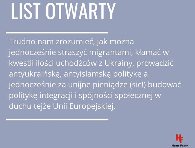 Stowarzyszenie Homo Faber nie wystartowało w konkursie ogłoszonym przez Wojewodę Lubelskiego. Jako wysłannik rządu w terenie odpowiada bowiem za realizację polityki tegoż rządu także w obszarze migracyjnym, a z tą niestety nie możemy się zgodzić. Trudno nam zrozumieć, jak można jednocześnie straszyć migrantami, kłamać w kwestii ilości uchodźców z Ukrainy, prowadzić antyukraińską, antyislamską politykę, a jednocześnie za unijne pieniądze (sic!) budować politykę integracji i spójności społecznej w duchu tejże Unii Europejskiej.