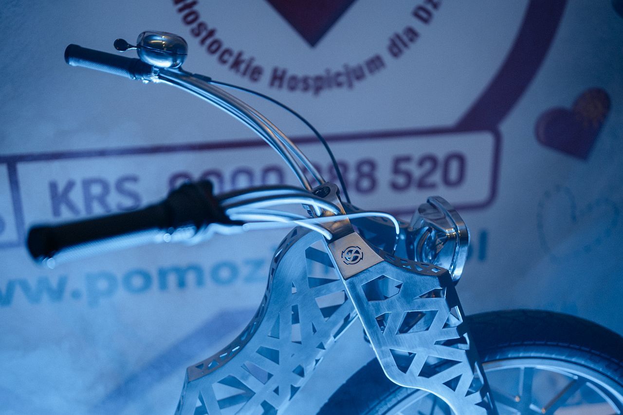 Młody wizjoner z Mad Bicycles stworzył projekt z mieszczącą się w podbiałostockich Sowlanach firmą alu-frost. Współpracują ze sobą na co dzień, a teraz postanowili wykorzystać wspólny potencjał do realizacji szczytnego celu. Jego beneficjentem będą podopieczni Białostockiego Hospicjum dla Dzieci, prowadzonego przez Fundację „Pomóż Im”. Firma alu-frost, jako jeden z darczyńców hospicjum, przekazała rower na internetową aukcję.