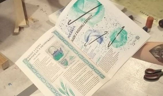 Uczestnicy i uczestniczki zaproponowali nam swoje własne przepisy, a następnie zaprojektowali i wykonali ilustracje do nich. Druk zina kucharskiego został zaplanowany w technice RISO. Dlaczego? Maszyny RISO są niskoemisyjne, a wykorzystywane farby bazują na oleju z otrębów ryżowych i nie zawierają toksyn.