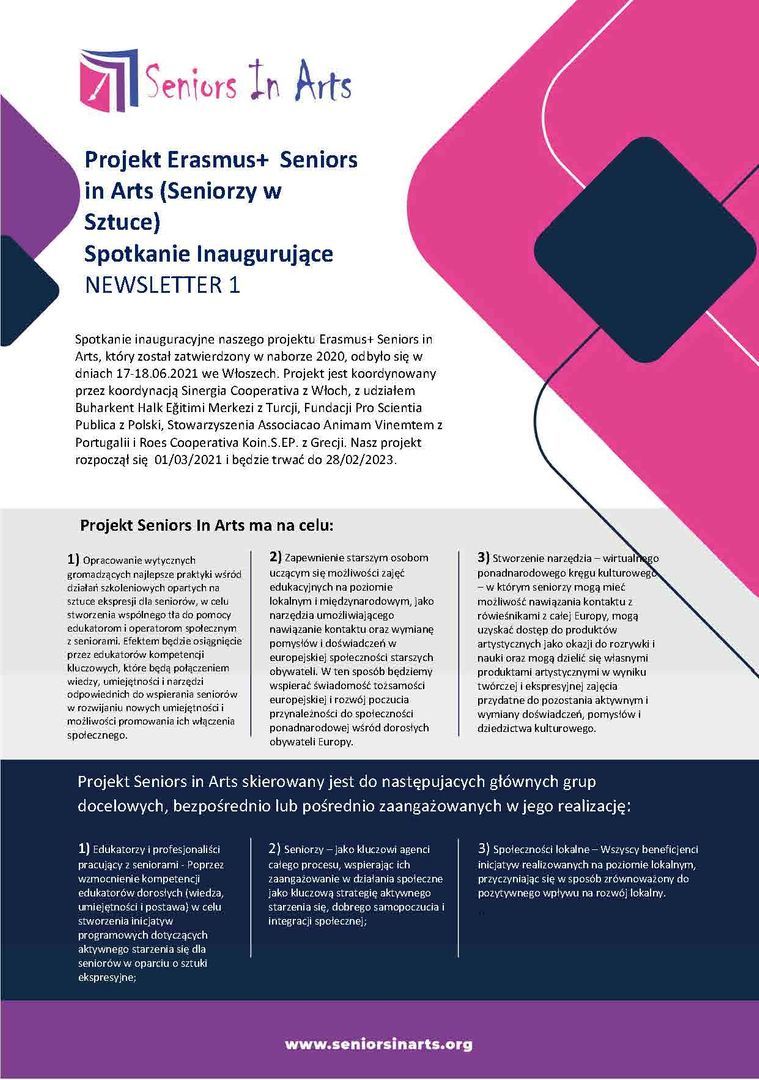 Rozpoczęty w marcu 2021 projekt partnerstw strategicznych Edukacji Dorosłych Erasmus+ Seniors in Arts (Seniorzy w Sztuce) ma na celu: