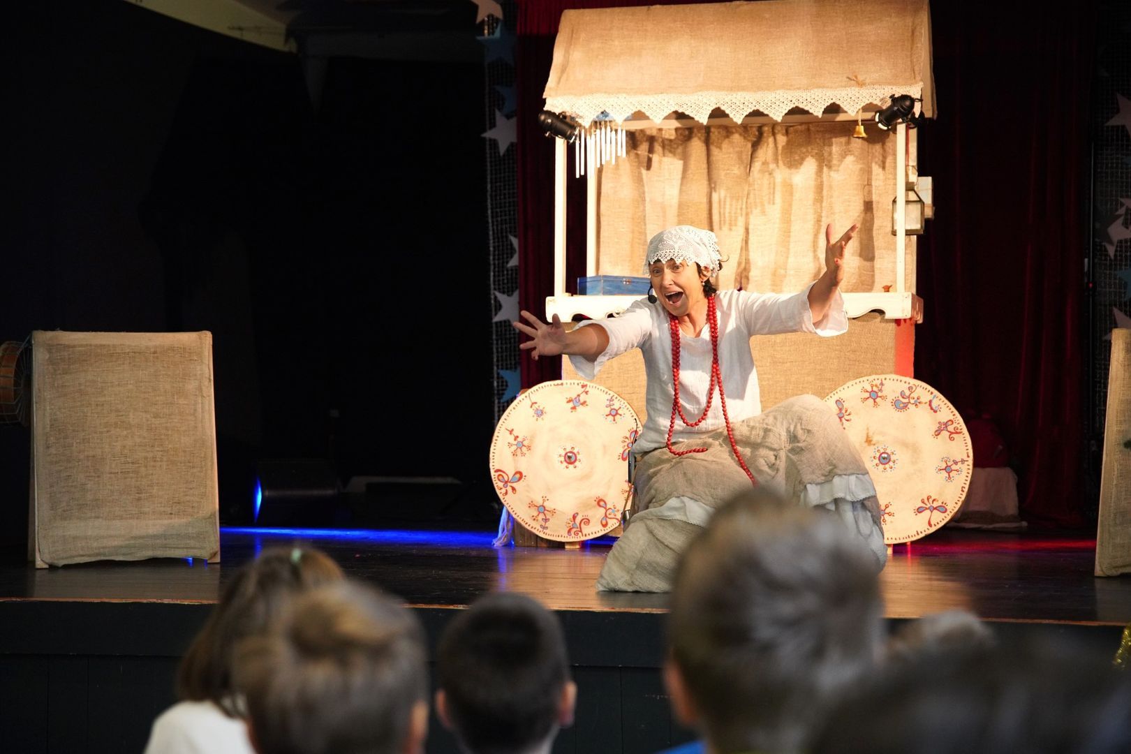 Osoba na scenie prezentuje fragment spektaklu inspirowanego tradycją ludową. W tle widoczna jest dekoracja przypominająca kram z opowieściami, a obok rekwizyty – okrągłe elementy z kwiatowymi wzorami i skrzynie obciągnięte jutą. Na pierwszym planie siedzą dzieci, uważnie obserwujące występ. Całość tworzy atmosferę kameralnego teatru, który przenosi widzów do świata dawnych historii.