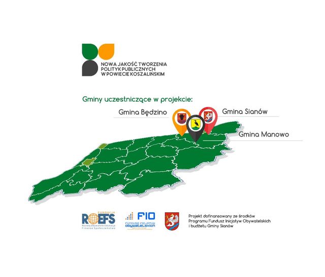 Gminą Sianów razem z Gminą Manowo i Gminą Będzino rozpoczęły realizację przedsięwzięcia pt. „Nowa jakość tworzenia polityk publicznych w Powiecie Koszalińskim”. To innowacyjny projekt, ma ponadgminny charakter i otwartą formułę zapraszającą przedstawicieli organizacji pozarządowych (klubów sportowych, OSP, fundacji i stowarzyszeń) do wspólnych wydarzeń, szkoleń i promocji III sektora w powiecie koszalińskim.
