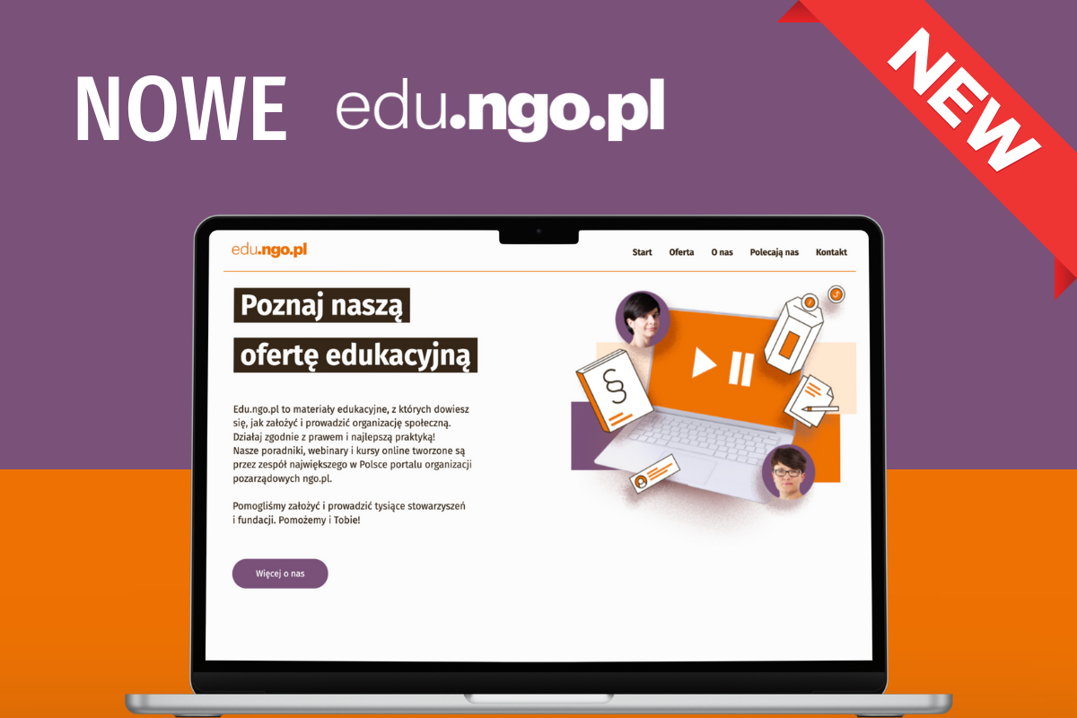 Z przyjemnością prezentujemy odnowioną stronę edu.ngo.pl – miejsce, gdzie znajdziesz praktyczne materiały edukacyjne: kursy online, webinary, poradniki PDF i instrukcje o zakładaniu i prowadzeniu organizacji pozarządowych!