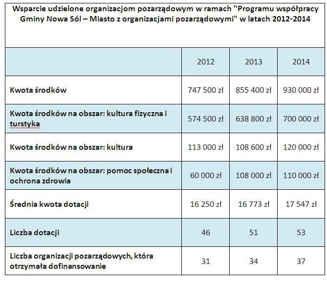Zainteresowanie publicznymi dotacjami z miasta jest duże ze względu na uproszczone procedury składania oferty, czy możliwość osobistego kontaktu z instytucją, która przekazuje środki. Kontrastuje to natomiast z zainteresowaniem organizacji pozarządowych konkursami ogłaszanymi na szczeblu krajowym, czy wojewódzkim. Warto w tym miejscu przypomnieć, że o środki np. z Funduszu Inicjatyw Obywatelskich w 2012 roku ubiegały się tylko 4 organizacje z Nowej Soli. Liczbę organizacji zabiegających o środki z Programu Operacyjnego Kapitał Ludzki w ramach komponentu regionalnego wdrażanego przez Urząd Marszałkowski, można także policzyć na palcach jednej ręki.
