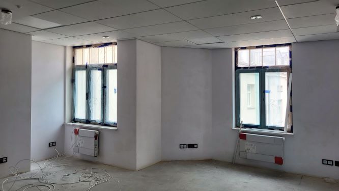 Wewnątrz kamienicy trwają prace wykończeniowe, takie jak wykonywanie nawierzchni podłóg oraz malowanie ścian. Trwa także montaż niezbędnych instalacji: elektrycznych, teletechnicznych i sanitarnych. Budynek został wyposażony w trzy windy osobowe i jedną towarową.