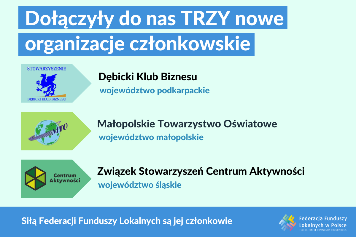 Fundusze lokalne to siła napędowa pozytywnych zmian w naszych społecznościach. Federacja Funduszy Lokalnych w Polsce rośnie w siłę, witając trzy nowe organizacje członkowskie z Podkarpacia, Śląska i Małopolski, które łączą biznes, społeczeństwo i samorząd, by budować silniejsze i bardziej zaangażowane społeczności.