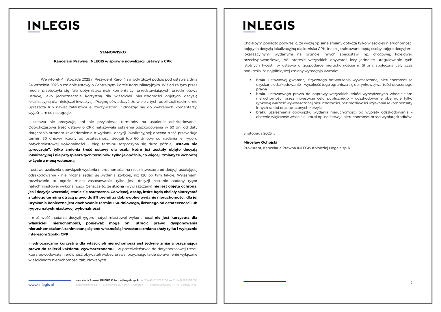 „Z niepokojem obserwuję medialne doniesienia na temat nowelizacji ustawy o CPK” – powiedziała Barbara Czerniawska, prezes Fundacji INLEGIS. „Założony w nowelizacji brak konsultacji oraz brak możliwości wypowiedzenia się przez stronę społeczną na etapie prac w Sejmie sprawił, że media oraz posłowie otrzymali wypaczony, bardzo jednostronny obraz sensu zapisów procedowanej ustawy. W efekcie tego – choć obywatele dostali niewiele, a absolutnym beneficjentem wdrażanych zmian jest jej inicjator: spółka CPK – nowelizacja powszechnie i myląco określana jest jako prospołeczna. Tymczasem społeczeństwo, a ściślej: właściciele, którzy muszą się liczyć z tym, że zostaną wywłaszczeni, nie mogą się doprosić poważnego potraktowania oczywistych postulatów, od lat konsekwentnie zgłaszanych kolejnym decydentom”.