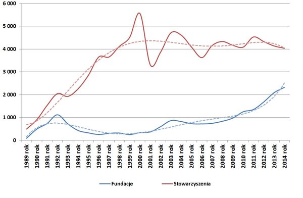 W samym 2014 roku powstało około czterech tysięcy nowych stowarzyszeń, co świadczy o stagnacji lub może nawet zapowiadać trend spadkowy (jeszcze w 2011 roku zarejestrowano ich około 4500, zaś w kolejnych latach ich liczba sukcesywnie spadała). Nieprzerwanie od 2007 roku rośnie natomiast liczba zakładanych fundacji, w ubiegłym roku zarejestrowało się ich ponad dwa tysiące.