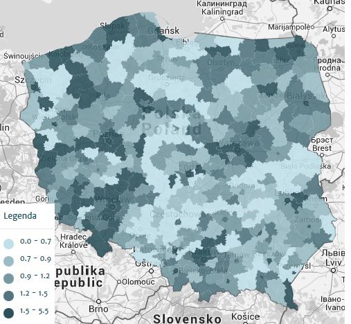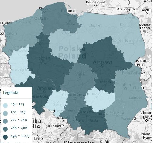 Porównanie regionów pod względem liczby nowo powstających organizacji pokazuje, że organizacje powstają tam, gdzie i tak jest ich najwięcej – na Mazowszu, w Małopolsce, Wielkopolsce i na Dolnym śląsku (patrz Mapa 1.). Dane o liczbie powstających organizacji na 10 tysięcy mieszkańców w powiatach (patrz Mapa 2.) potwierdzają, że organizacje powstają przede wszystkim w dużych miastach i ich okolicach (rzuca się jedynie w oczy mniejsza dynamika powstawania organizacji na Górnym Śląsku i aglomeracji Katowickiej).