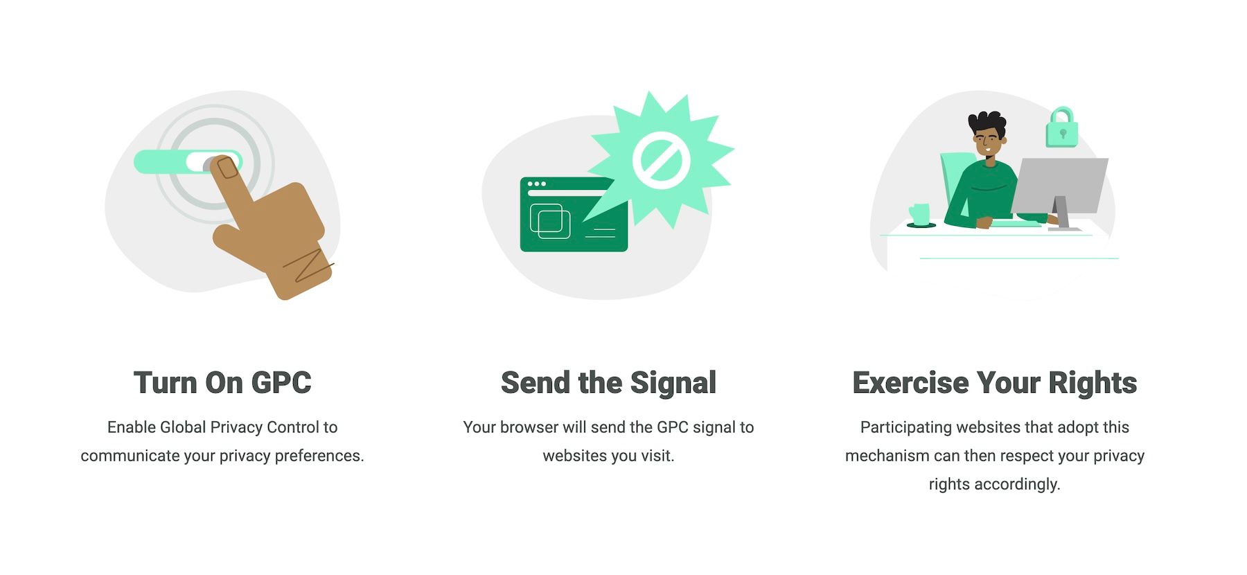 Propozycja GPC umożliwia użytkownikom sieci sygnalizowanie, że nie chcą być śledzeni w Internecie, a w stosownych przypadkach dochodzenie praw do prywatności zgodnie z przepisami, takimi jak RODO w UE i CCPA w Kalifornii. GPC jest pomyślane jako dodatkowe narzędzie ochrony prywatności dla dostawców przeglądarek i użytkowników sieci. Nie zastępuje jednak żadnych istniejących zabezpieczeń prywatności.