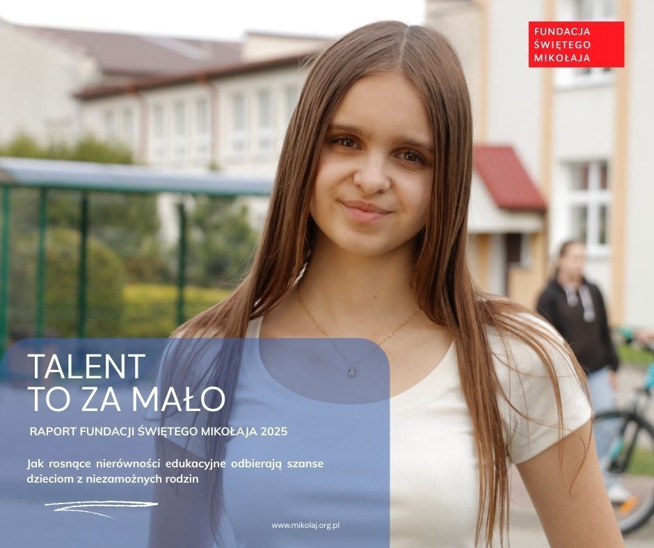 600 tysięcy dzieci w Polsce z powodów finansowych nie ma możliwości rozwijania swoich talentów i pasji, a w tym ok. 12 tysięcy jest szczególnie uzdolnionych – szacuje w najnowszym raporcie „Talent to za mało. Jak rosnące nierówności edukacyjne odbierają szanse dzieciom z niezamożnych rodzin” (2025) Fundacja Świętego Mikołaja. Raport publikowany w 15. rocznicę otwarcia ogólnopolskiego programu stypendialnego św. Mikołaja, pokazuje jak bardzo potrzebne jest dziś wsparcie najzdolniejszych polskich dzieci, które nie mają środków na rozwój. Stypendium może być jedyną szansą na wykorzystanie drzemiącego w nich potencjału.