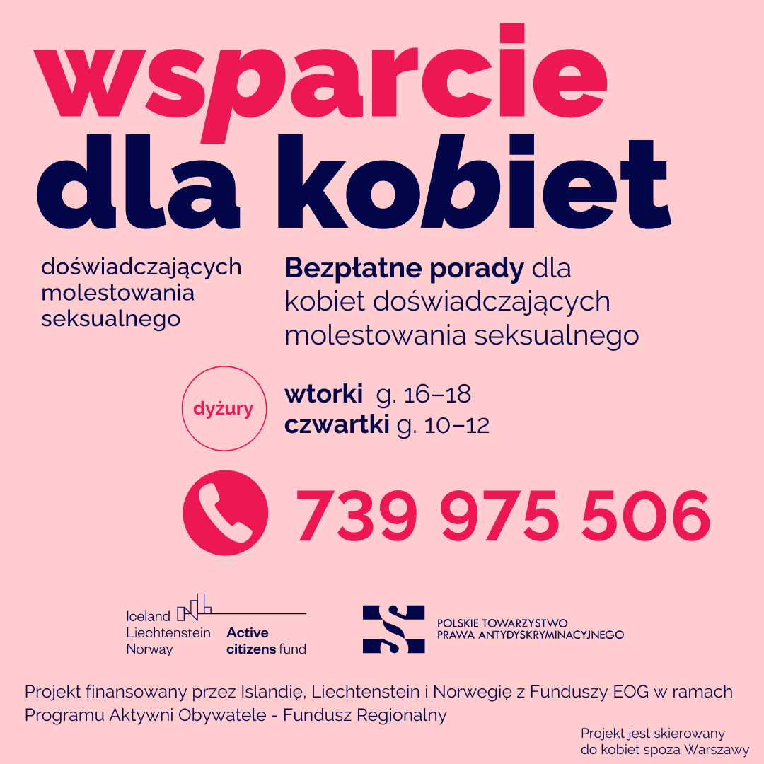 Skorzystaj z darmowej pomocowej linii telefonicznej dla kobiet doświadczających molestowania seksualnego i innych form dyskryminacji ze względu na płeć, obsługiwanej przez profesjonalne prawniczki – 739 975 506.