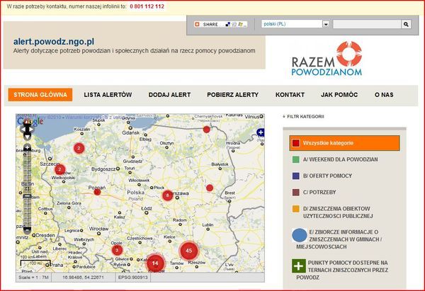 Ruszył serwis alert.powodz.ngo.pl stworzony, by wymieniać się informacjami na temat sytuacji na terenach poszkodowanych przez powódź. Na stronie serwisu można zostawić prośbę o wsparcie, informację o aktualnych potrzebach lub wiadomość o własnej ofercie pomocy. Swój alert może zostawić każdy. Twórcą interaktywnej strony jest inicjatywa “Razem Powodzianom”.