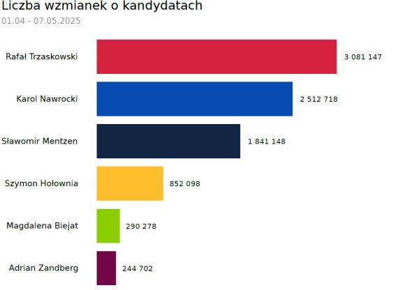 W ujęciu ilościowym największą uwagę internautów przyciągnęli główni kandydaci w wyścigu prezydenckim – Rafał Trzaskowski i Karol Nawrocki – to ich nazwiska pojawiały się najczęściej, generowały najwięcej wyświetleń i wzbudzały największe emocje. Nazwisko Trzaskowskiego pojawiło się w ponad 3 milionach treści. Na drugim miejscu uplasował się Karol Nawrocki z wynikiem przekraczającym 2,5 miliona wzmianek. Podium zamyka Sławomir Mentzen, którego wspomniano w ponad 1,8 miliona wpisów. Ponad dwukrotnie rzadziej wspominano Szymona Hołownię – 852 tysiące wzmianek. Wśród ocenianicy kandydatów najmniej uwagi w sieci poświęcono Magdalenie Biejat (290 tys.) i Adrianowi Zandbergowi (245 tys.).
